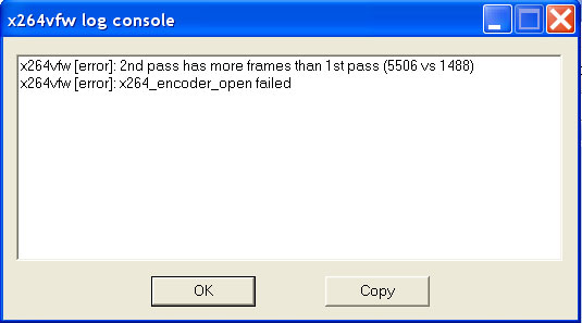 I try multipass render with x264vfw and VDub gives me this error message. VDub loads the video and even plays it, but stops rendering 1/2 way through the job.