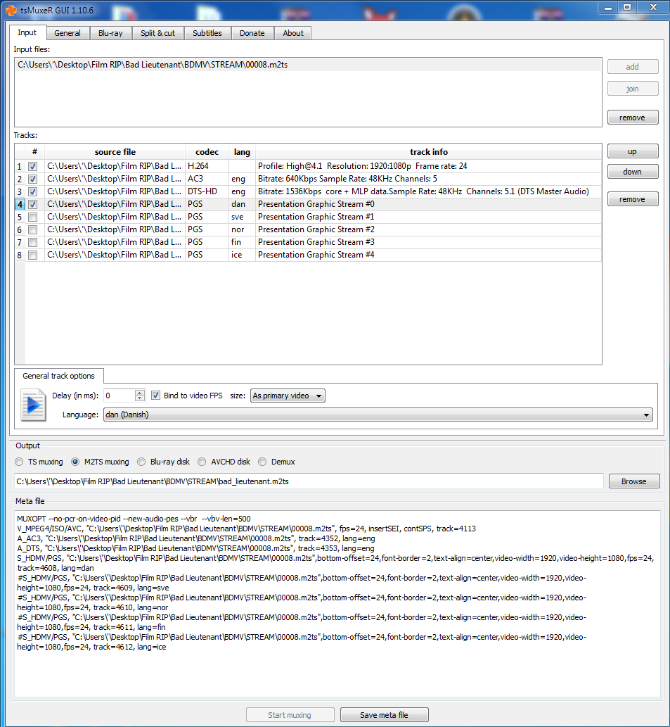 then i use tsMux to select only the movie and the sound with the Danish Sub (as u see here)