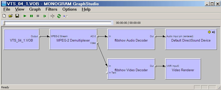 The graph above shows data flowing from left to right. First is a File Reader, a filter that tells Windows this is indeed an A/V file and it knows how to handle it. Next is a File Splitter that separates the compressed audio and video streams (sometimes the File Reader and File Splitter are combined into one filter). Those compressed streams are then sent to appropriate decompressors (ffdshow in this case). Finally, the decompressed streams are sent to renderers that play the audio and display the video.