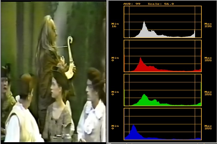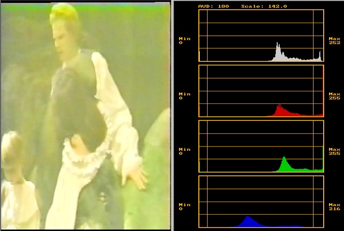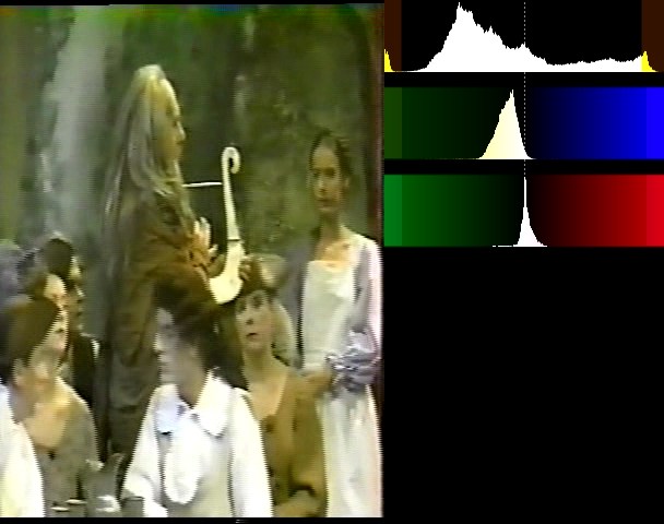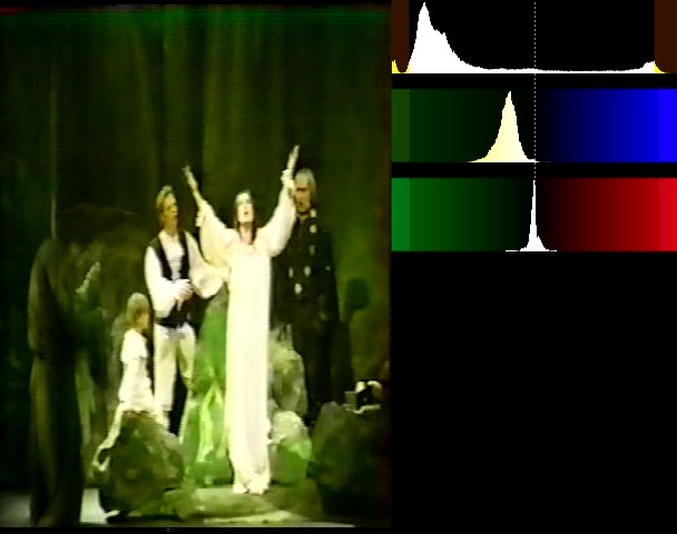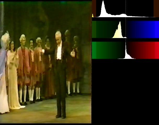 You ain't seen nothin' yet. Gets worse. I assembled 1-min 47-sec from the vid's suitably climactic mid-Victorian finish. By that time the noise level is evil, highlights are fried, blue nearly gone, etc. I cut most of the applause and then dissolved to the last curtain call, and cut some rolling credits and some lead-out. At the end you see the tape stop and then Aiwa's logo; the right-side red stain ends and histograms look normal. But the top border stripe turns pink and persists, with many pink rainbows (from the player? the recorder? Cheap copy adapter? Crummy composite wire?)