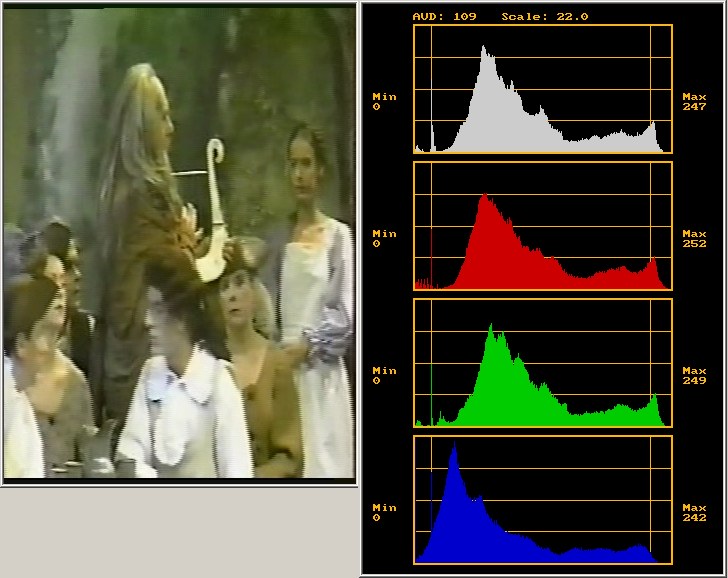 The cap below is the same frame in RGB32 (PC.601, RGB 0-255). ColorTools shows the slow, early slope in Red and Green, making the video look washed out. Blue is displaced left and slopes too late, getting clipped at the low end. On tyhe right side, Blue peaks too early and slows too early, at least for this broad-spectrum scene.