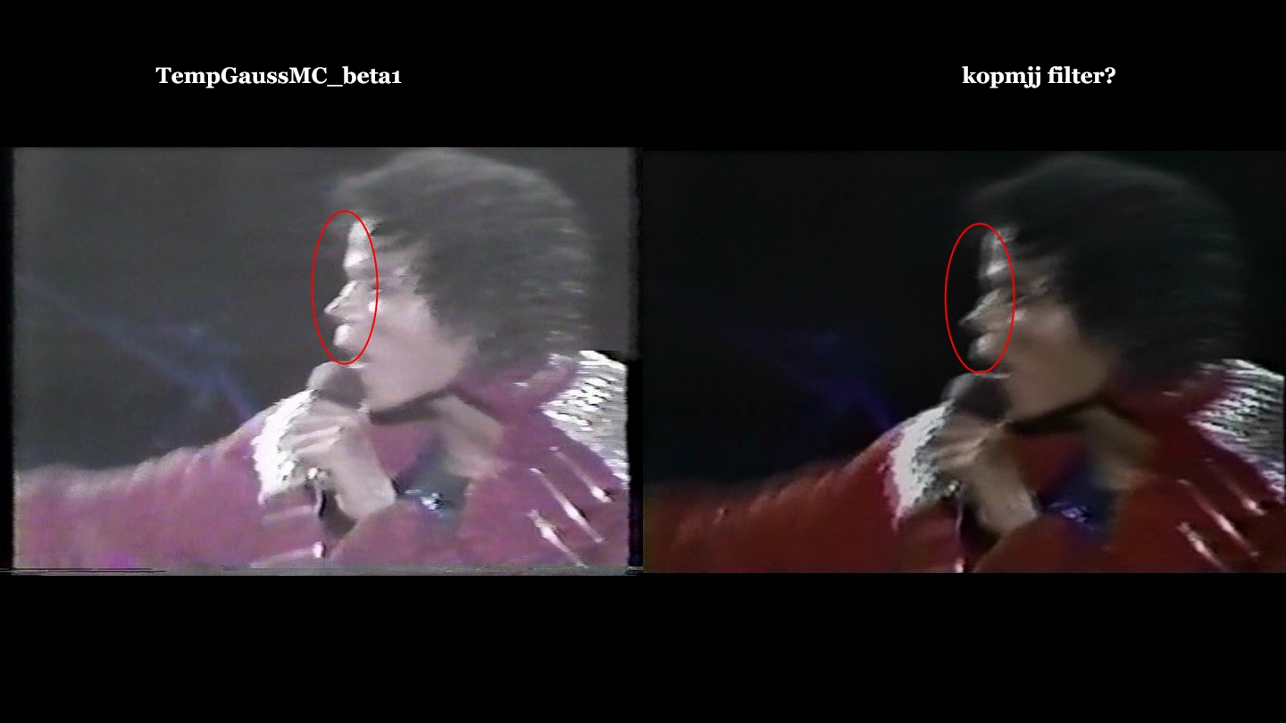 The thing that bugs me the most about this is the wavy motion or frame warping. It's the stillness and calmness of kopmjj's version that appeals to me - mathmax you said the background was very calm earlier - that's what I mean. Somehow his version has all straighter lines, and less wavy line motion, and it's not as simple as antialiasing. You can't really see it on a single screenshot, it has to be in motion. I think that 1st screenshot above is a different artifact, like motion prediction error from mvtools & tgmc, due to the jitter artifact (if you look at mj's sideburn , it's displaced horizontally, but in kopmjj's version, it's magically inline and straight; but it's not "perfect" because his forehead still has a "pit" from the remenants of deinterlacing)Last edited by poisondeathray; 25th Jul 2010 at 22:43.
