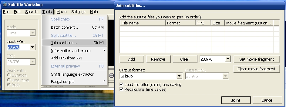 I worked with subtitle workshop but there isn't any option to join srt in Tools.
