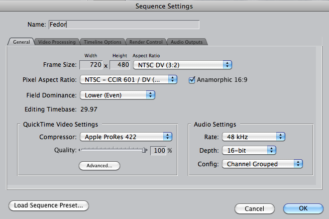 My PROBLEM comes when I try to bring in 720p HD footage into this sequence. In the viewer it looks great, but when I actually bring it into the timeline and play it back in the canvas, it is fuzzy and poor quality. I have included an image of what I am seeing, as well as the sequence settings I am currently using (first is the viewer and canvas side by side. Look for the difference in the letters to see the drop in quality. The second image is my sequence settings)