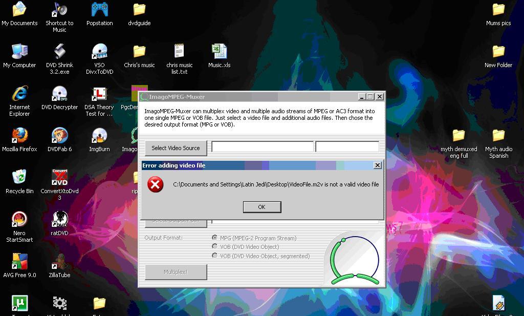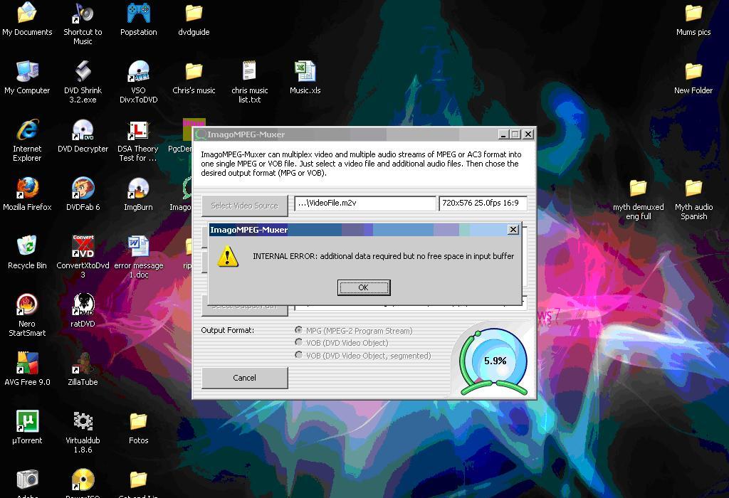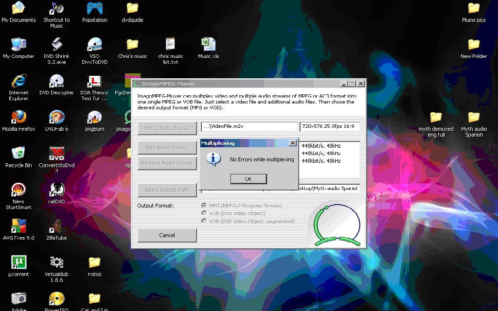 I then tried the remuxing, however on using the English Video stream (which is better quality) I got an error message saying "VideoFile.m2v is not a valid video file"so, I had to use the Spanish video stream (which is lower quality, it had leaked a bit) this was a bit better but I still got an error message at 6% into the remuxing which said "INTERNAL ERROR: additional data required but no free space in input buffer"