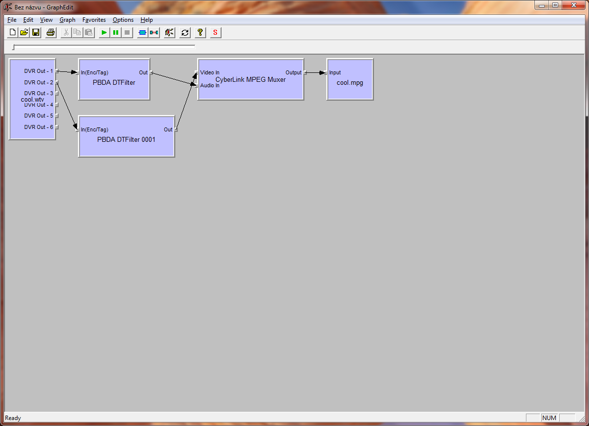 5. After closing filter window we need to make a chain again by dragging each of the "Out" pin to the "Video in" and "Audio in". Arrows must cross because "DVR Out - 1" carries audio and "DVR Out - 2" video. So we connect DVR out with MPEG Muxer and with the Dump filter which will create the desired output.