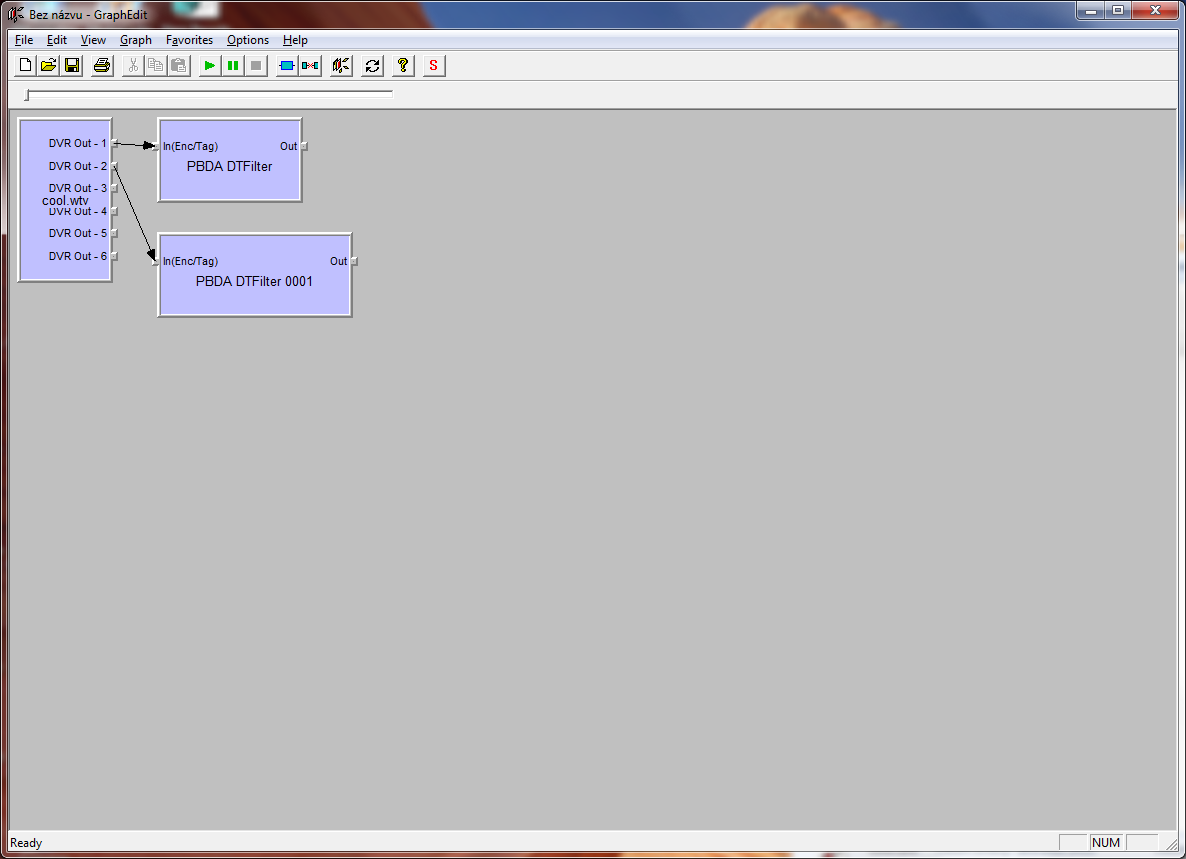 5. After closing filter window we need to make a chain again by dragging each of the "Out" pin to the "Video in" and "Audio in". Arrows must cross because "DVR Out - 1" carries audio and "DVR Out - 2" video. So we connect DVR out with MPEG Muxer and with the Dump filter which will create the desired output.