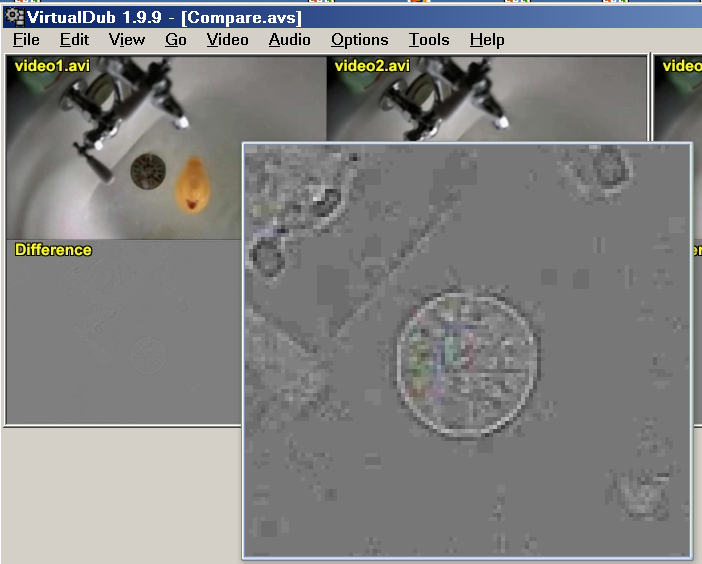 5. You can use AviSynth's StackHorizontal() or StackVertical() to put two videos side-by-side. You can use the Subtract function to see the differences between the two. And Levels to amplify those differences. Here's one script that shows the two videos side-by-side, the differences, and the differences multiplied: