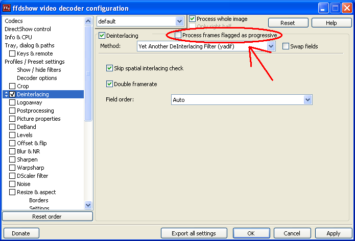 Yes your settings are correct. Maybe the OPs files arent' correct. Maybe they're marked interlaced. Maybe ffdshow is just confused by the 1920x1080p60 file. It safest to turn off deinterlacing just to be sure. Then if that works then he can go back to see why deinterlacing wasn't working.