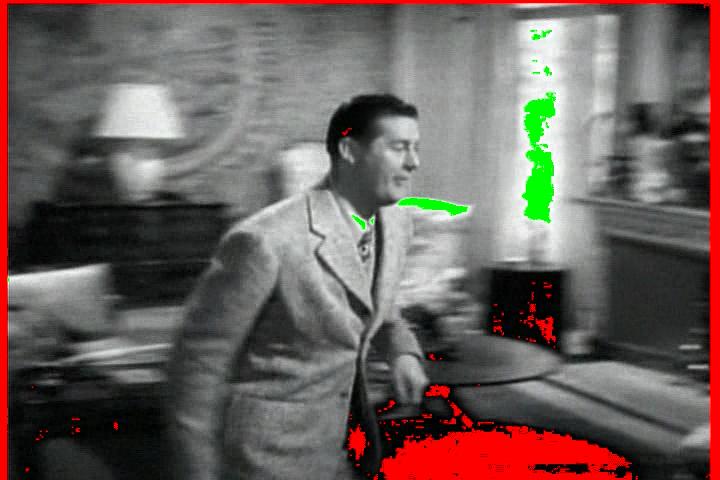 Since this movie is b&w, I'm not seeing any green/red blobs. If I'm suppose to, then something is wrong on my end. -