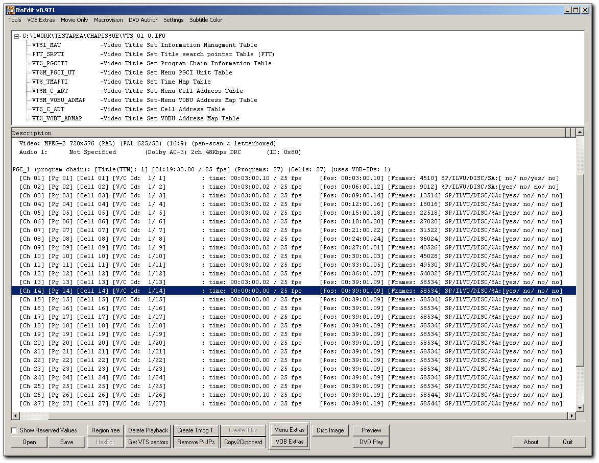 FYI: The reason WMP etc can handle the incorrect IFOs is because the start points of the chapters are ok. Therefore you can navigate to them and play then. What V2M and IFOEdit are doing is making use of the end point and it is this which is wrong here.SVCD2DVD v2.5, AVI/MPEG/HDTV/AviSynth/h264->DVD, PAL->NTSC conversion.