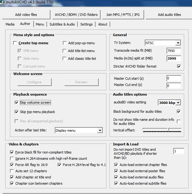 Thanks for all the suggestions. I disabled all the options in the author and the menu tabs and that did produce a movie only that will auto play with just a very short multiAVCD "promo" screen at the beginning. However my source was 31 separate avi files and it treated each as a separate "movie" and created 31 m2ts files which play with a very noticeable "bump" at the transition between the m2ts files. Is there a way to get the program to create a single m2ts file??