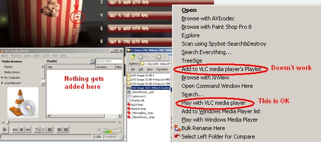 As shown in the following screenshot, when I R-click a DVD folder and choose Add to VLC media player's Playlist, it doesn't work. No entry is added to VLC's playlist.