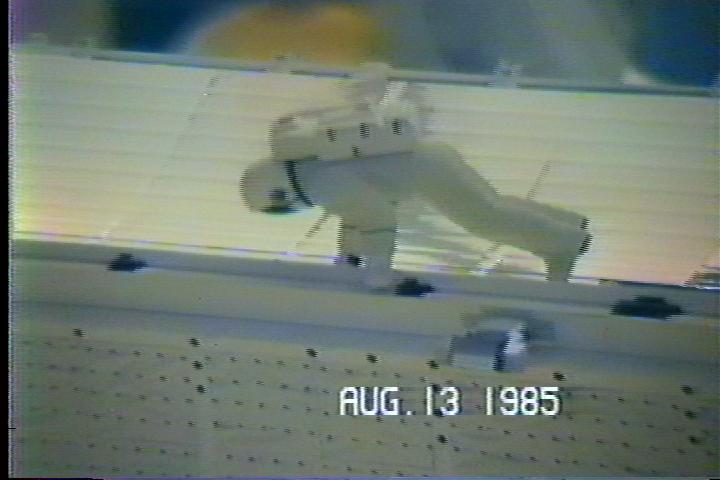 Because the camera's RGB sensors were all overloaded, all driven to full intensity, hence you get white. Whereas the yellow parts of the picture aren't at full intensity. Or maybe it's illuminated from below? Then in subsequent VHS to VHS transfers the levels and colors were further screwed up. Note the green cast on the arm even when it's horizontal -- hence it's not a left/right chroma shift. And I'm pretty sure it's not a vertical chroma shift since the rest of the image gets screwed up if you shift the chroma vertically.