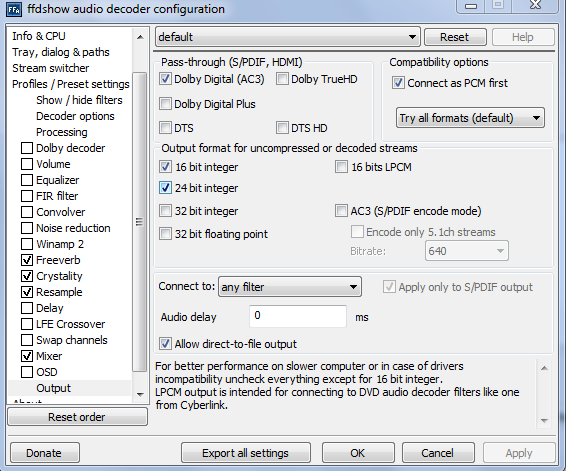But,de-muxing 5.1ch --> GraphEdit and Channel Downmixer ---> 2 ch ---> muxing to video, without any delays is another issue. Alternatively give WinAVI Video Converter a try!Last edited by Bonie81; 29th Nov 2010 at 17:26.