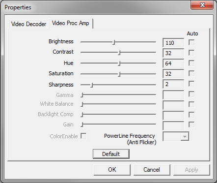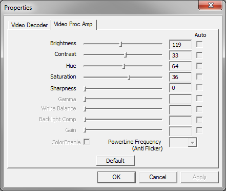 The Proc Amp settings are stored in the registry, but can't actually be set by it. The settings on the Capture filter page somehow overwrite the reg values as soon as you start a capture graph again.Code:Windows Registry Editor Version 5.00 ; remember that dwords are hex, not decimal ; exact registry location will differ by hardware install [HKEY_LOCAL_MACHINE\SYSTEM\CurrentControlSet\Control\Class\{4D36E96C-E325-11CE-BFC1-08002BE10318}\0009\settings\DecoderProperties] "VCRMask"=dword:00000000 ; # of lines masked out [equal top and bottom] "MaskColor"=dword:00000000 ; 0=Gray, 1=Black [HKEY_LOCAL_MACHINE\SYSTEM\CurrentControlSet\Control\Class\{4D36E96C-E325-11CE-BFC1-08002BE10318}\0009\settings\OEMSettings] "AC97VolumeLN"=dword:00000040 ; Line IN AC97 source balance adjustments - valid range 0..127 [Default 64, but 127 seems to actually lower volume] ; there are a bunch of other settings here that do nothing, including entire blocks copied from eMPIA's webcam drivers