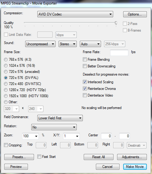 - frame size: 720 x 576 (DV-PAL)