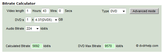 * From the bit rate calculator you will see the required average bit rate for 1hr 43 minutes is 5692 Kbps video, 224 Kbps audio or less.