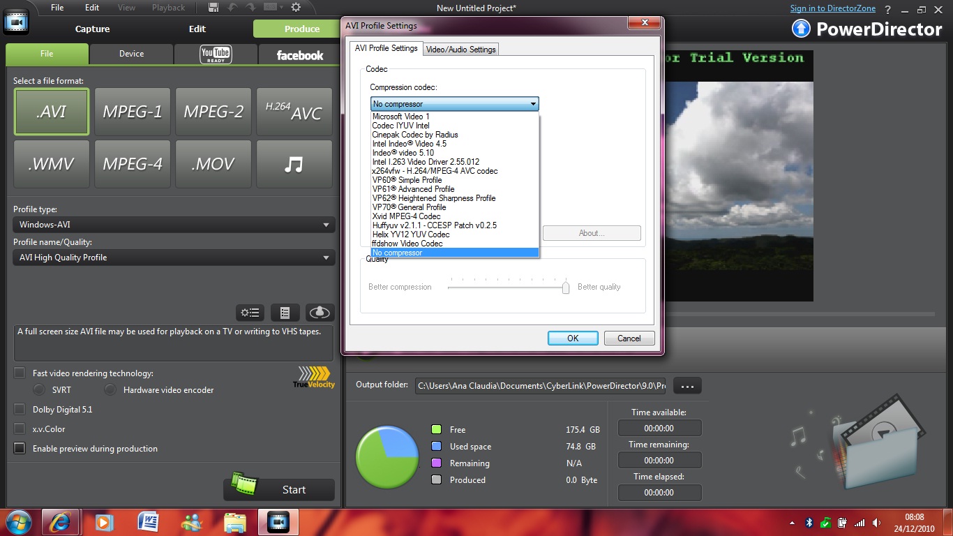 Regarding power director or any other program - you need to match 64-bit to 64-bit and 32-bit with 32-bit programs and .dlls. x264vfw has 2 versions. If you're using 64-bit , then you need 64-bit xvid as well for it to show up as an option. You can use 32-bit programs in a 64-bit OS