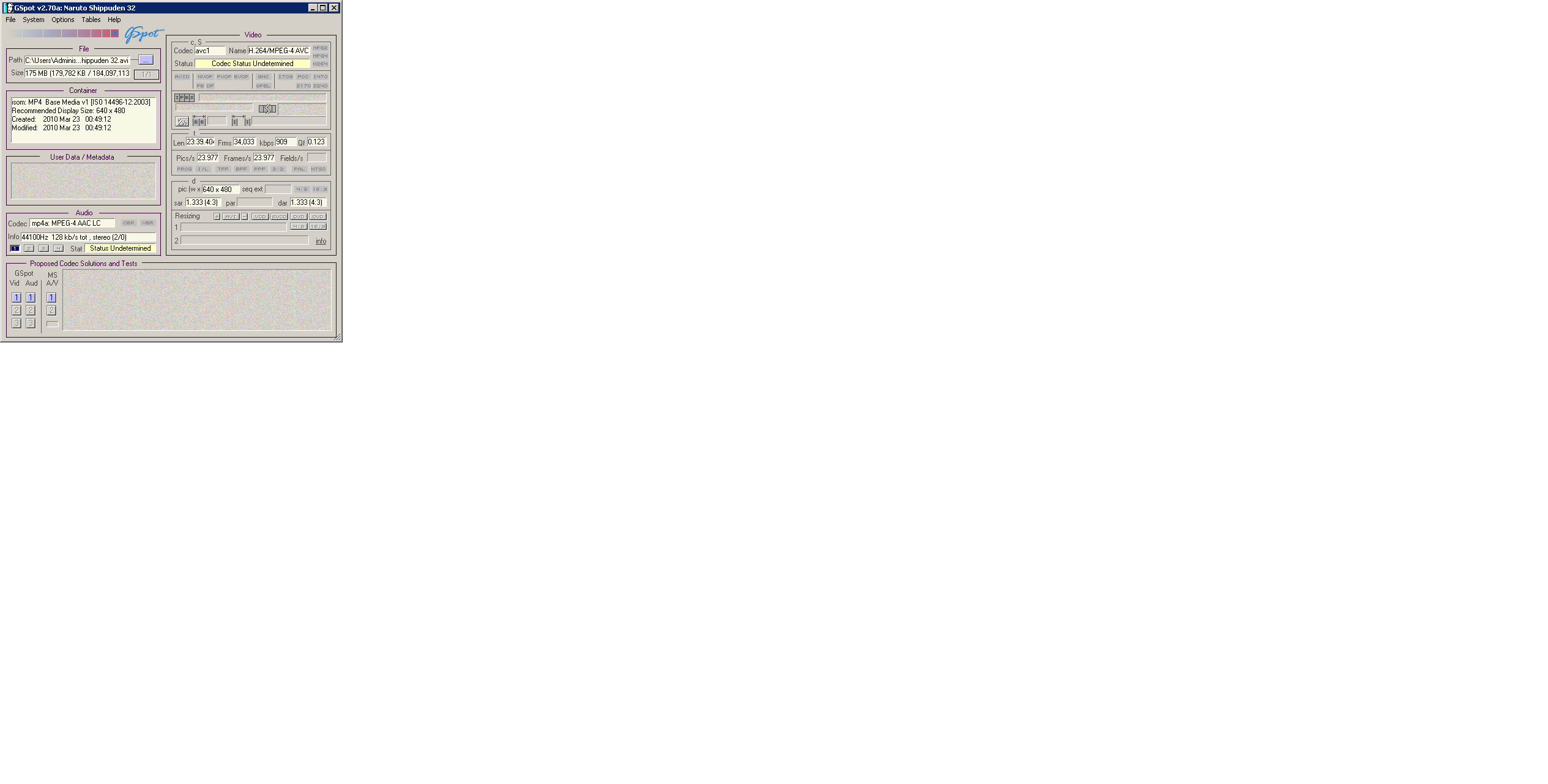 how do I play this video?Code:General Complete name : C:\Users\Administrator\AppData\Roaming\uTorrent\naruto shippuden Season 1\Naruto Shippuden 32.avi Format : MPEG-4 Format profile : Base Media Codec ID : isom File size : 176 MiB Duration : 23mn 39s Overall bit rate : 1 038 Kbps Encoded date : UTC 2010-03-22 07:49:12 Tagged date : UTC 2010-03-22 07:49:12 Video ID : 1 Format : AVC Format/Info : Advanced Video Codec Format profile : High@L3.1 Format settings, CABAC : Yes Format settings, ReFrames : 8 frames Codec ID : avc1 Codec ID/Info : Advanced Video Coding Duration : 23mn 39s Bit rate mode : Variable Bit rate : 906 Kbps Maximum bit rate : 5 742 Kbps Width : 640 pixels Height : 480 pixels Display aspect ratio : 4:3 Frame rate mode : Constant Frame rate : 23.976 fps Color space : YUV Chroma subsampling : 4:2:0 Bit depth : 8 bits Scan type : Progressive Bits/(Pixel*Frame) : 0.123 Stream size : 153 MiB (87%) Writing library : x264 core 80 r1376M 3feaec2 Encoding settings : cabac=1 / ref=8 / deblock=1:1:1 / analyse=0x3:0x133 / me=umh / subme=6 / psy=1 / psy_rd=0.6:0.0 / mixed_ref=1 / me_range=16 / chroma_me=1 / trellis=2 / 8x8dct=1 / cqm=0 / deadzone=21,11 / fast_pskip=1 / chroma_qp_offset=-2 / threads=6 / sliced_threads=0 / nr=0 / decimate=1 / mbaff=0 / constrained_intra=0 / bframes=16 / b_pyramid=0 / b_adapt=1 / b_bias=0 / direct=3 / wpredb=0 / wpredp=2 / keyint=250 / keyint_min=25 / scenecut=40 / rc_lookahead=40 / rc=2pass / mbtree=1 / bitrate=906 / ratetol=1.0 / qcomp=0.60 / qpmin=10 / qpmax=51 / qpstep=4 / cplxblur=20.0 / qblur=0.5 / ip_ratio=1.40 / aq=1:0.00 Encoded date : UTC 2010-03-22 07:24:42 Tagged date : UTC 2010-03-22 07:49:15 Audio ID : 2 Format : AAC Format/Info : Advanced Audio Codec Format version : Version 4 Format profile : LC Format settings, SBR : No Codec ID : 40 Duration : 23mn 39s Bit rate mode : Variable Bit rate : 128 Kbps Maximum bit rate : 140 Kbps Channel(s) : 2 channels Channel positions : Front: L R Sampling rate : 44.1 KHz Stream size : 21.7 MiB (12%) Language : English Encoded date : UTC 2010-03-22 07:49:14 Tagged date : UTC 2010-03-22 07:49:15