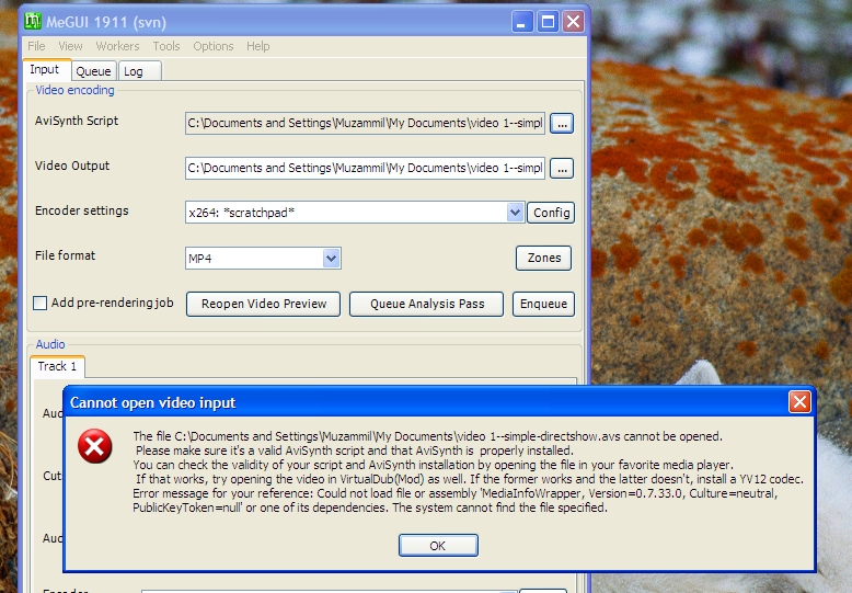 I get the following error when i open the avs script which is to be inputed to megui created using avisynthesizer