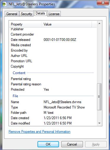 usually_quiet, the file reported that it was protected. It had a license tab and in the properties it said it was. I tried loading the file into handbrake and it reported that the file was either encrypted, protected, or badly authored. I then copied the raw dvr_ms file to a wd passport hdd I receintly picked up and hooked it up to my western digital media player, navigated to the file and it played. I tried loading the file into Nero Vison and it loaded, edited, and exported cleanly. Might I add the new version of Nero Vision is so much improved since version 6.