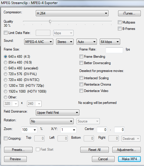 i rest the aac audio bitrate to 64kbps, no reason to make it more. the mpeg-4 exporter is just easier to set up, but i would leave the size 640x480 alone, as it will retain better quality if it isn't re-sized also. try both and see what you like.