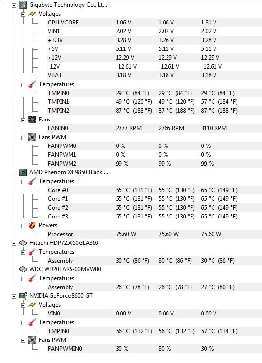 I would also ignore the TMPIN2 temps. With AMD, not sure that's a valid reading. Even my North Bridge chip comes nowhere near that temp. Your GPU (Video card) may show temps in the 50 - 55C range. About average for them. Your hard drives are running fairly cool, another indication that your case cooling is working correctly.