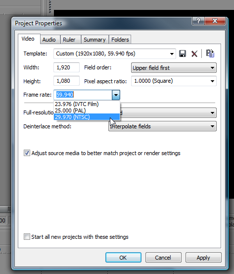The only possible out is "match media settings" mode. To test that, I'd need to generate a test 1920x1080 60p file in Vegas Pro. Not my top priority tonight.