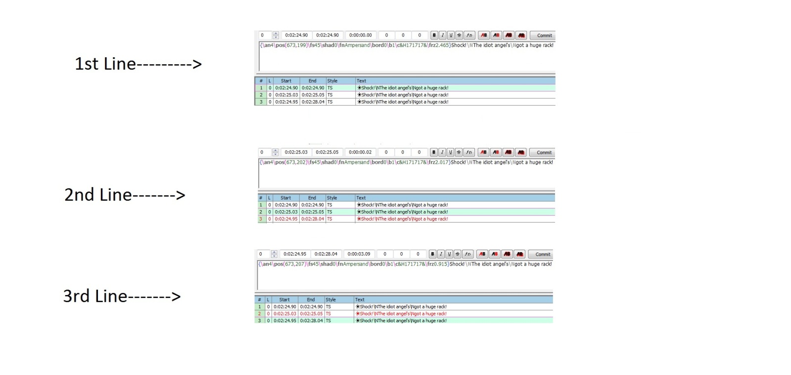A) All 3 script lines courtesy Aegisub(Apologies in advance as lines were pretty long so 1 screenshot with all 3 lines instead to avoid error.): Click image for larger version