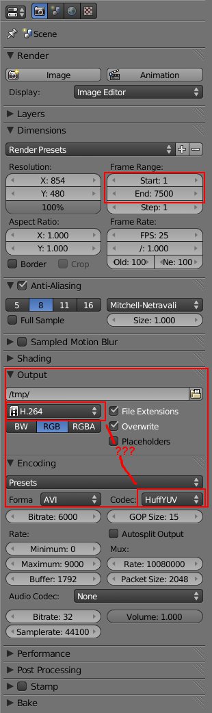 The Output/Encoding boxes are quite confusing - I don't think options like GOP size and Bitrate serve any purpose for codecs like HuffYUV. Also, the 'Encoding' options aren't even visible unless H.264, MPEG, OGG Theora or Xvid is selected in the 'Output' settings - and then there's an inconsistency if another codec like HuffYUV is selected (see screenshot). Also ISTR the resolution I've got set (854x480) might cause problems with huffyuv (not mod16?) ...but I digress.