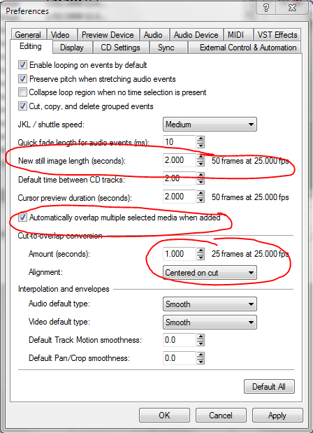 It looks like I need to putter with the values in the Pref->Editor. We do seem to have different versions of Vegas. Mine is 9.0. See attached. (I might have added two that are the same. I can't see what is attached.) It seems that my duration is so small, 0.25, that there's little chance to see a dissolve.