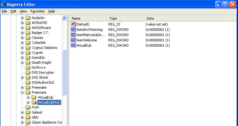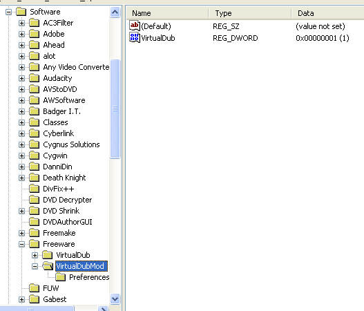 HKEY_CURRENT_USER/Software/Freeware/VirtualDubMod -