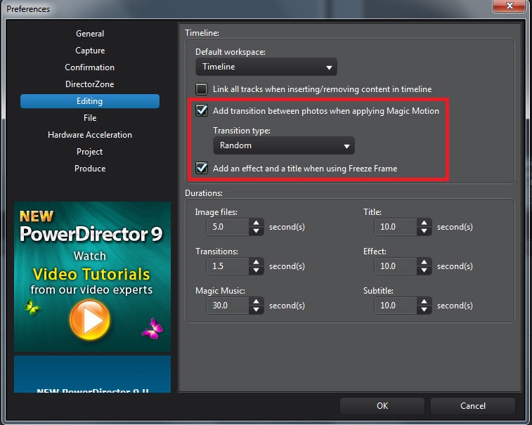 Can you do auto-transition or auto-audio fade in PowerDirector?