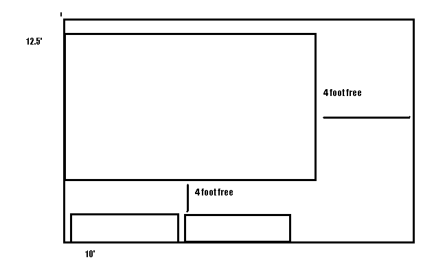 I have a desk on the long part that extends about a foot, bringing the width of the room down to about 8 feet, and a futon that brings the rest of the room down to about 7 to 8 feet wide. I have the 9 foot wide part mainly near my door and my closet, where I have about a foot to two feet in length for space to put up the green screen. I'm thinking, is all of this good space, or should I move into my sister's vacant room down the hall? It is a 10 foot wide by 12.5 foot long room. There's about 4 feet of free space on each side.![]()