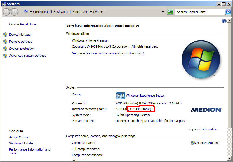 Agreed that the reason for your issue is that a 32 bit operating system can only handle up to 3.5GBs of RAM, if you intend to use more than that you'll need a 64 bit operating system. Before you may choose to do that you'd need to also make sure that your processor is 64 bit compatible, which I believe it is.