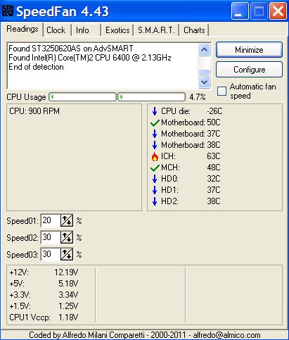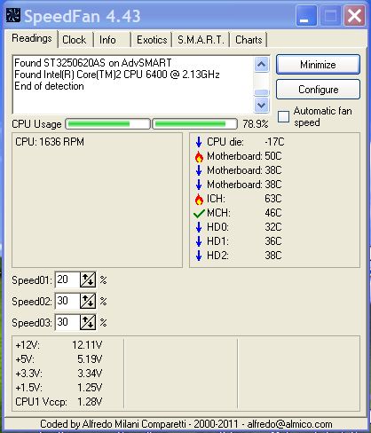 The place where I order the fan didn't get it in, so I tried another place and the guy had the fan in stock and he really seems to know what he is doing, so I am going to take my computer to him again. Here are the latest readings with the fan installed at the back now in addition to the one installed near the hard drives. . I am not doing much on the computer at the moment. I will post one later when I am doing some encoding and then we will know what those reading are. Thanks to everyone who gave me advice