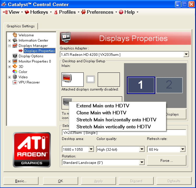 I have only tried the other 2 desktop modes with a more modern ATI video card than yours and a 1920x1080 LCD monitor connected using DVI, plus a 4:3 CRT monitor set a 640x480 connected using VGA. You will need to rely on Nelson37's experience for setting up TVs. My video card has no compatible connections to use with my SD CRT TVs.