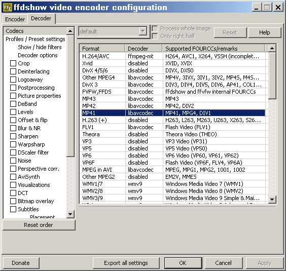 Start -> All Programs -> ffdshow -> VFW Configuration -> Decoder -> Codecs -> MP41