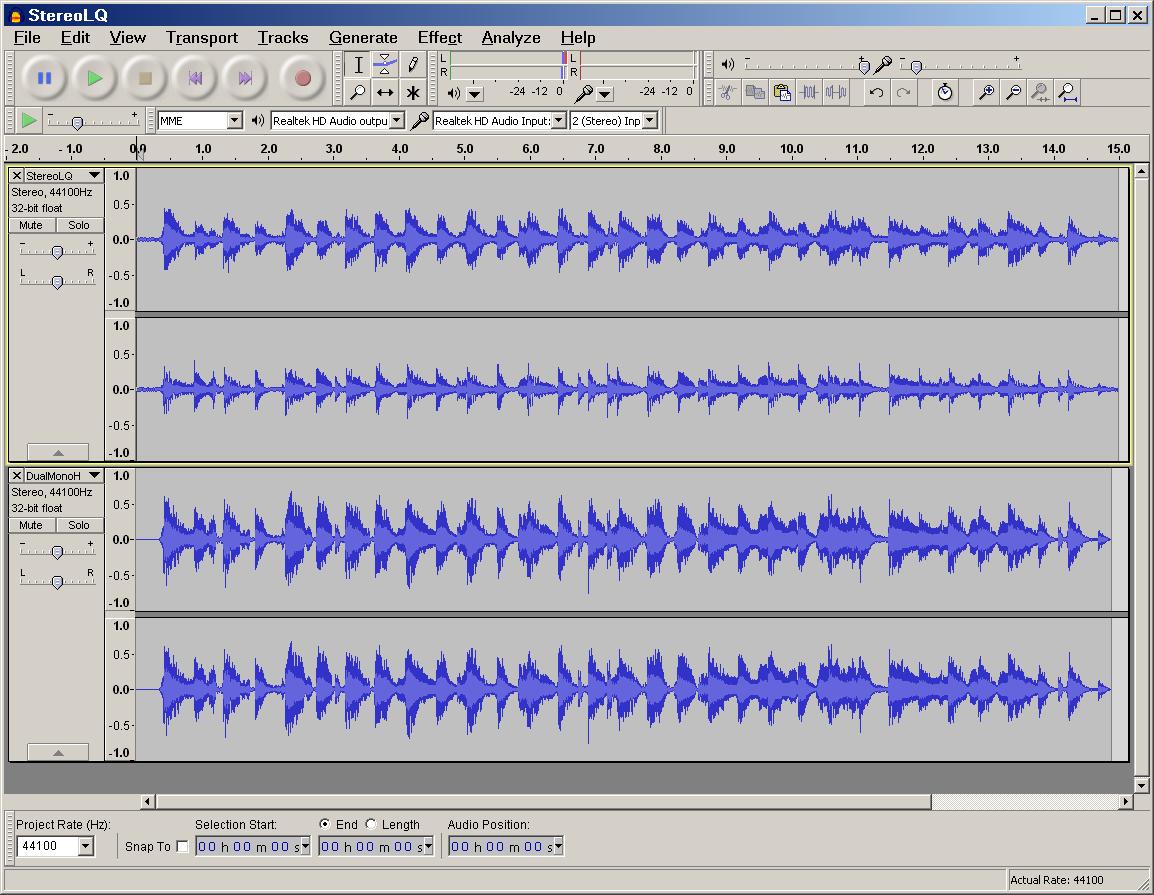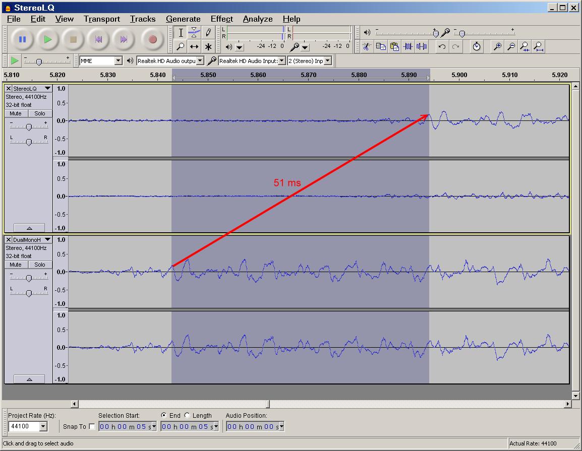 So I shifted the the low quality stereo track left by 51 ms: