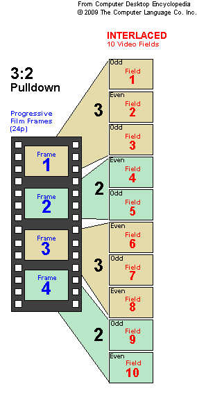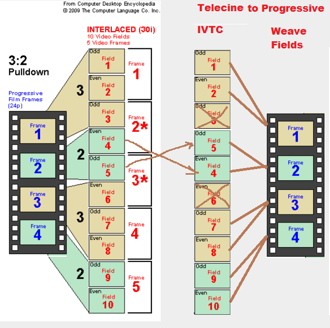For the record, we have been mentioning inverse telecine (IVTC) as a way to reverse 59.94 fields per second telecine back to 23.976 fps progressive frames. Every HDTV set uses this process to convert 480i or 1080i telecine to progressive for display. Here is a diagram of the process.