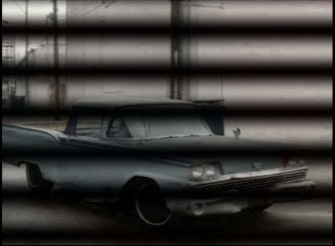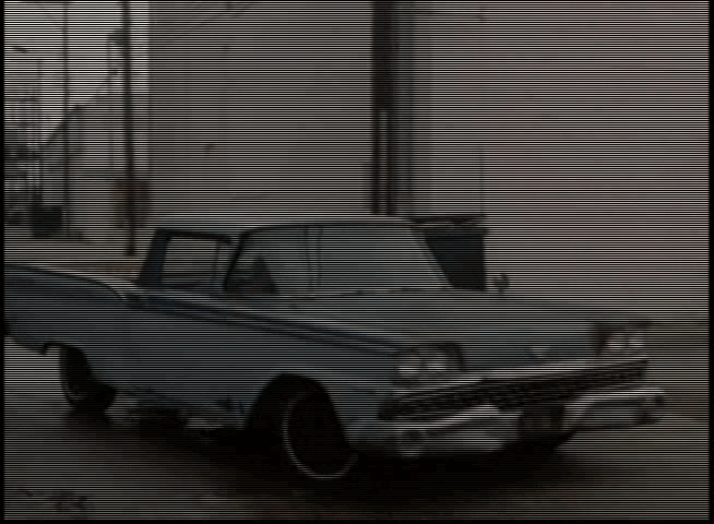 Click on the images to view them full size. Note how each image only contains half the picture. There is a black line between each line of picture information. It's a little hard to tell looking at two separate image but when when you switch back and forth between them you can see that the car has moved between the two fields: