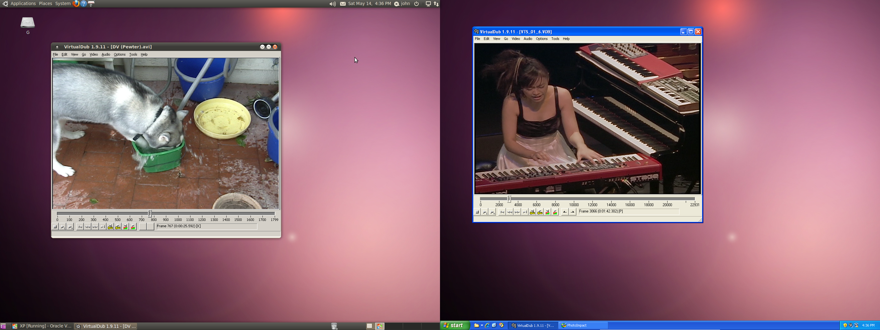 Here's a picture of my Ubuntu system running VirtualDub under Wine (on the left) and VirtualBox (on the right) in seamless mode.