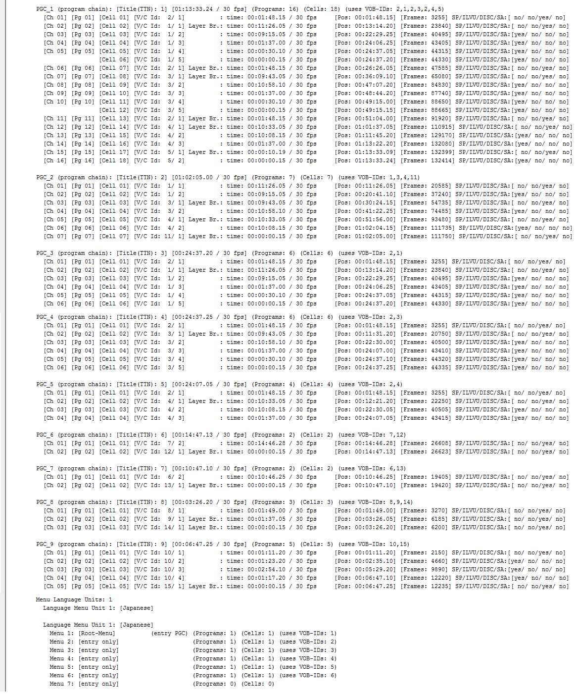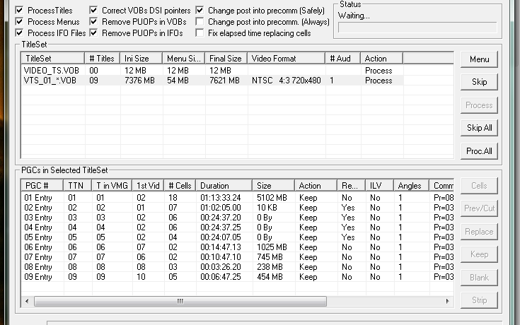 The structure is different when I demux by VobID. There are 15 vobid files as opposed to those 9 Pgc's I mentioned, and I don't even know where to begin on how to inject them into the original ifo with VobBlanker, let alone what to do with the multiple celltimes files.