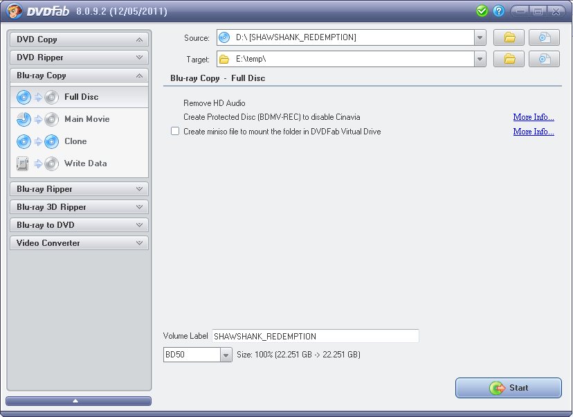 - Rip the Blu-ray to your HDD with DVD Fab HD Decrypter, start it and choose HD Decrypter, choose your Blu-ray drive and set the target folder(you need a lot of HDD Space) and start: