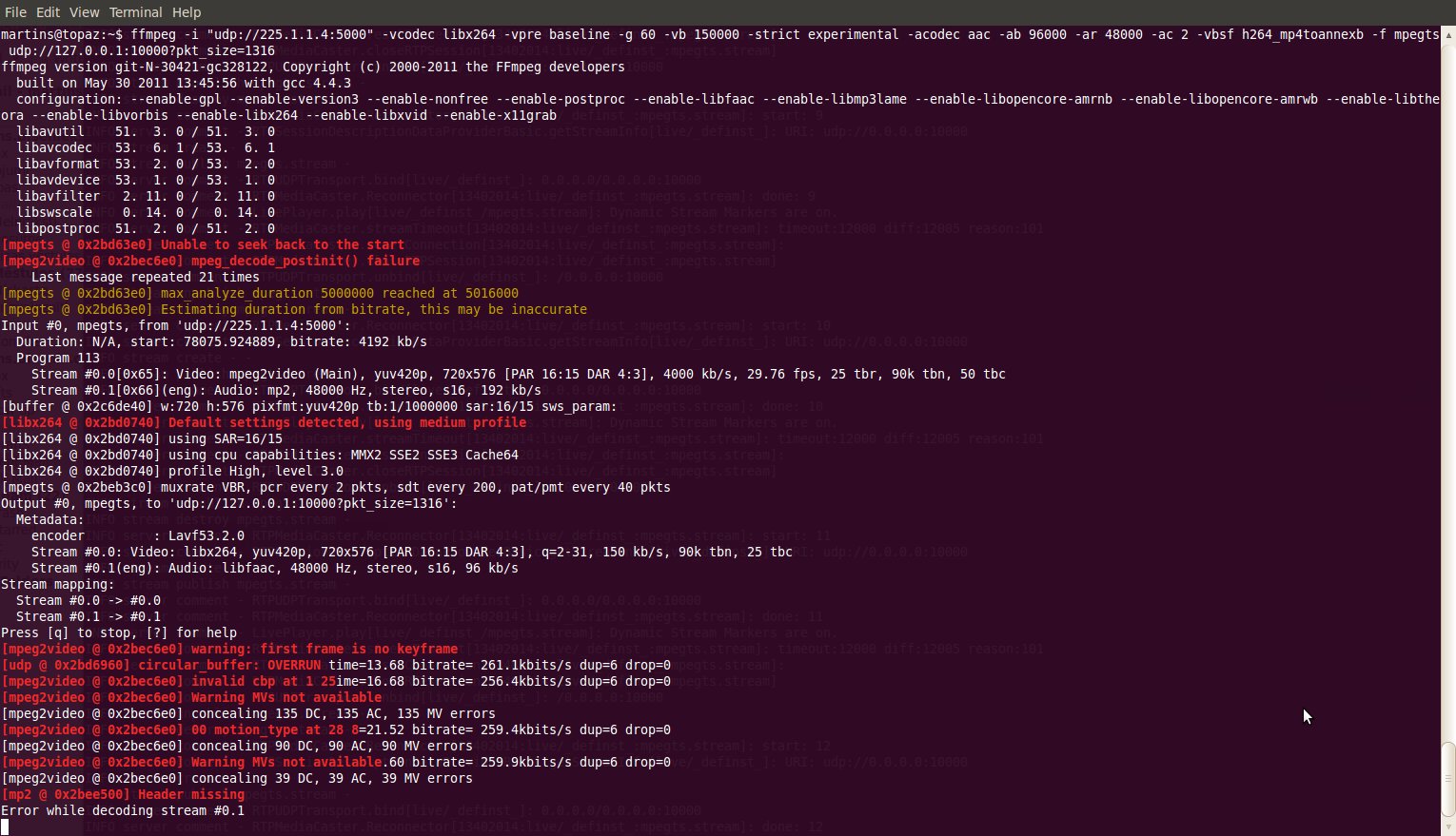 I'm trying to take udp stream and send it to wowza media server with ffmpeg. It works fine at the beginning but it crashes after some seconds... I attach a screenshoot witch console log. Mybe somebody can help me... i hope so....