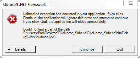 Could not find a part of the path 'C:\Users\Bud\Desktop\FileName_Subtitle\FileName_S ubtitle\bin\Debug\Work\budman.ico'.