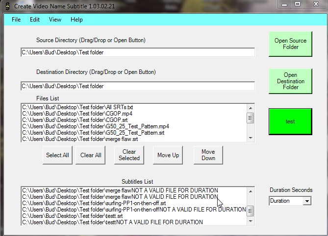 The folder boxes source and destination are entered by 'File' dropdown,. source button, or drag and drop (drag a file and it will automatically enter the folder name. The test button is the button to create the subtitle files in the folder. I used the same one for source and destination so they would all be in the same folder. It works for me but it's late and I didn't want to recompile to change the test buttons name something more appropriate like "Create Subtitles" LOL