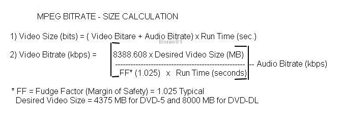 Following formulas hold good for MPG / MPEG stream video size and bit rate calculations
