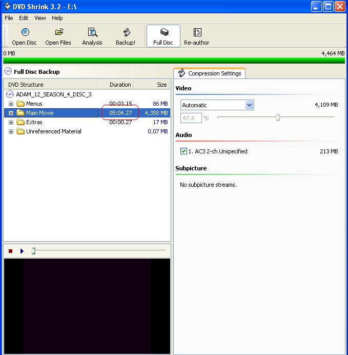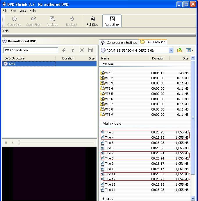I have an episodic TV show on dvd disc. There are six 25 min. episodes on the disc so the running time is 2hrs 30 min. When I open it in DVD Shrink full disc mode, it says the running time is 5 hours! In re-author mode, there are 12 titles instead of 6. The titles are doubled, each twin has the same 25 min. running time and size.